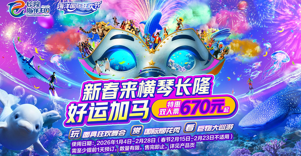 【费用包含】珠海长隆海洋王国成人票2张+珠海长隆企鹅酒店极地房1晚(不含早餐)